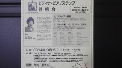 ピアノステップ説明会を代表を務めるTSUKUBAふれあいステーション主催で開催しました。ピティナ本部の岩山さんがピティナが現在行っている事業に関して説明くださり、次に林苑子先生によるステップの詳しい説明が続きました。林先生は説明のみならず、課題曲の演奏法指導法、選曲方法活用方法のセミナーも行ってくださり、たいへんためになりました。とても意義のある説明会となりました。後半の指導法演奏法の講座は専門的な内容でしたが、ステップに参加されたり参加検討中のお子様のお父様やお母様には特に聞いていただきたいなあと思う内容でした。