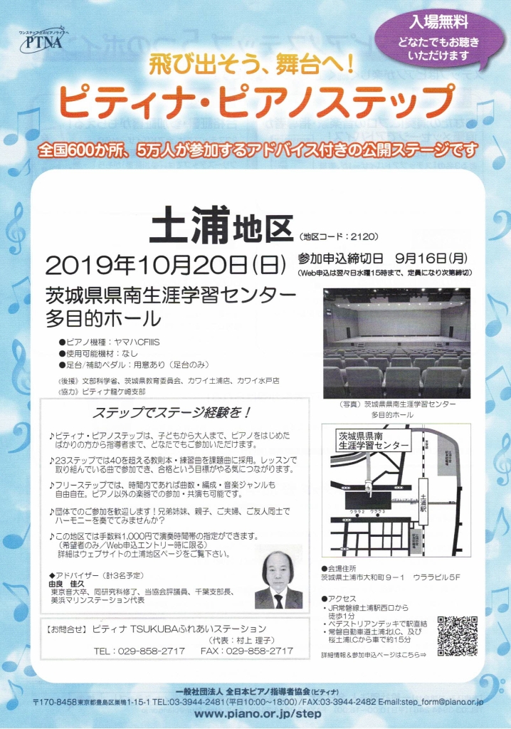 2019・10・20(日)土浦地区ピアノステップのチラシをご紹介します。参加出演者募集中です。