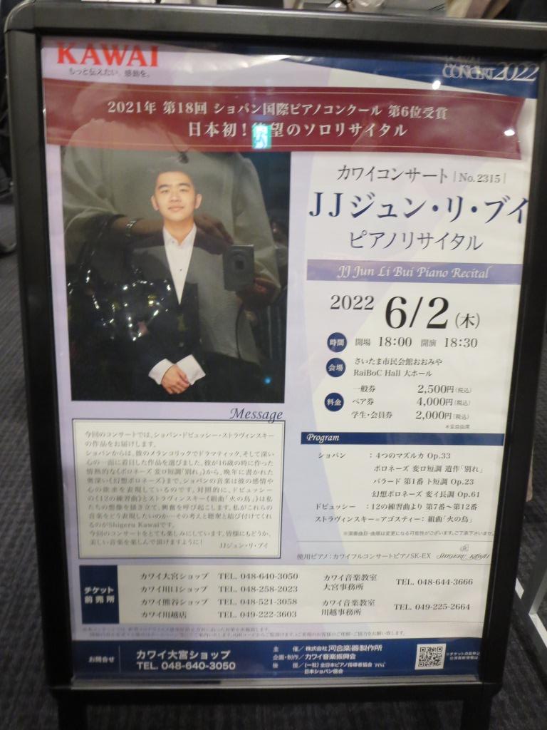 昨日はカワイ楽器水戸店の渡邉様にお誘いいただいて、AYAKO先生と2021年ショパンコンクールに第6位に輝いたJJジュン・リ・ブイ氏のピアノを聴きに大宮へ行ってきました。