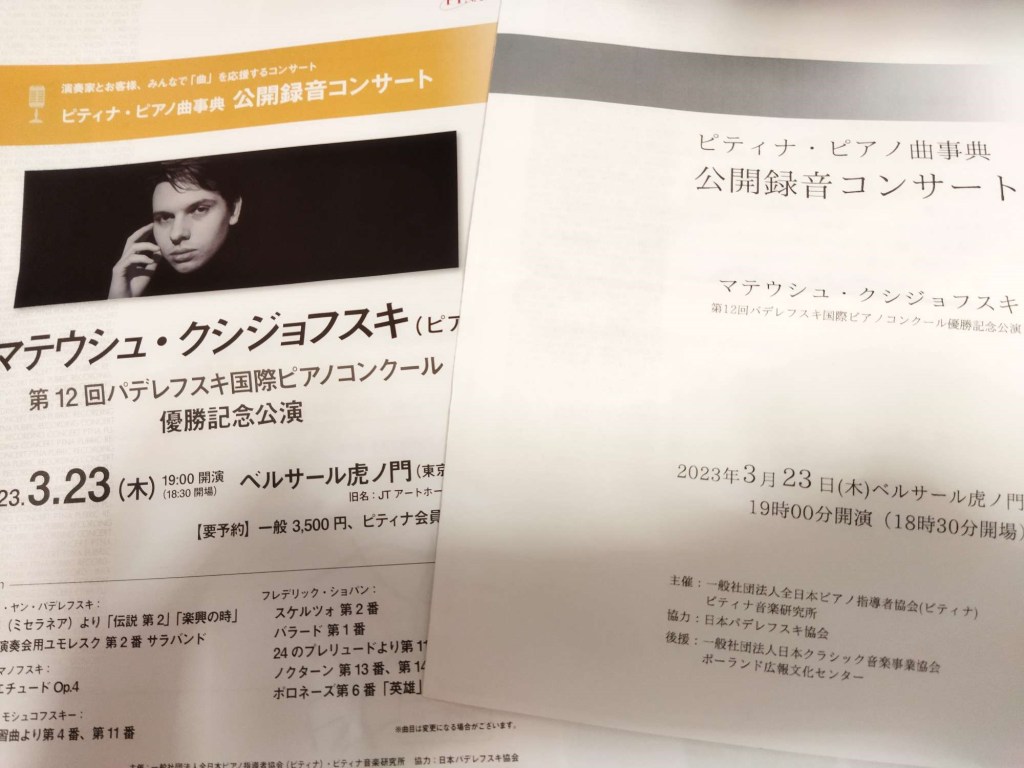 3月23日木曜夜 ピティナ公開録音コンサート《マテウシュ・クシジョフスキ》の第12回パデレフスキ国際ピアノコンクール優勝記念公演》を聴きに行きました。豊かで情感あふれるピアノ、若い素晴らしい才能
