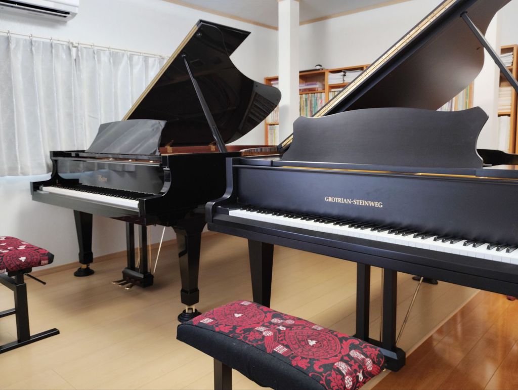 2月14日にリフォーム工事のため隣室に移動していたグランドピアノを教室へ戻しました。再び、2台ピアノでのレッスンがスタートしています。アンサンブルやコンクール対策にも最適な環境です。