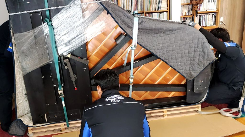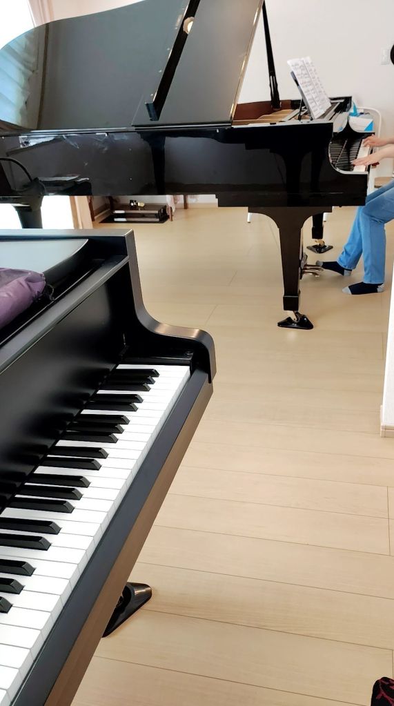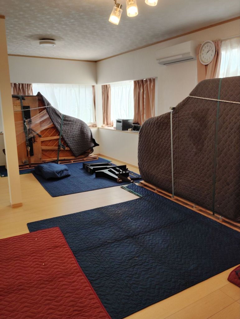 当教室の二つのピアノレッスン教室の3台のピアノは、3回の工事の度、大工さんにどこをどんな風にどんな順番でいつ工事するかお聞きしてから、私のレッスンスケジュールを調整し、3回ピアノ運送業者さんにお願いして移動しました。ピアノの移動や配置換えは宅内で移動距離は短いけれども、内容は、解体・梱包・搬入・再設置、まさにピアノの引っ越しです。ピアノは大きさによって、移動料金が違いますし、特にグランドピアノはピアノの脚やペダルは外して1台ずつ梱包してから移動します。ピアノ移動は専門の運送業者男性3人~4人で行われました。新しいレッスン教室は、ピアノのタッチと響きをしっかり耳で確かめながら演奏することができます。レッスン生のMちゃんが、レッスンの帰り際に「この部屋の響き、好き」と笑顔で一言。