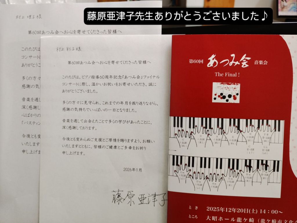 2025年12月20日、ピティナ龍ヶ崎支部長・藤原亜津子先生主宰の「あつみ会」音楽会60年ファイナルコンサートが開催されました。