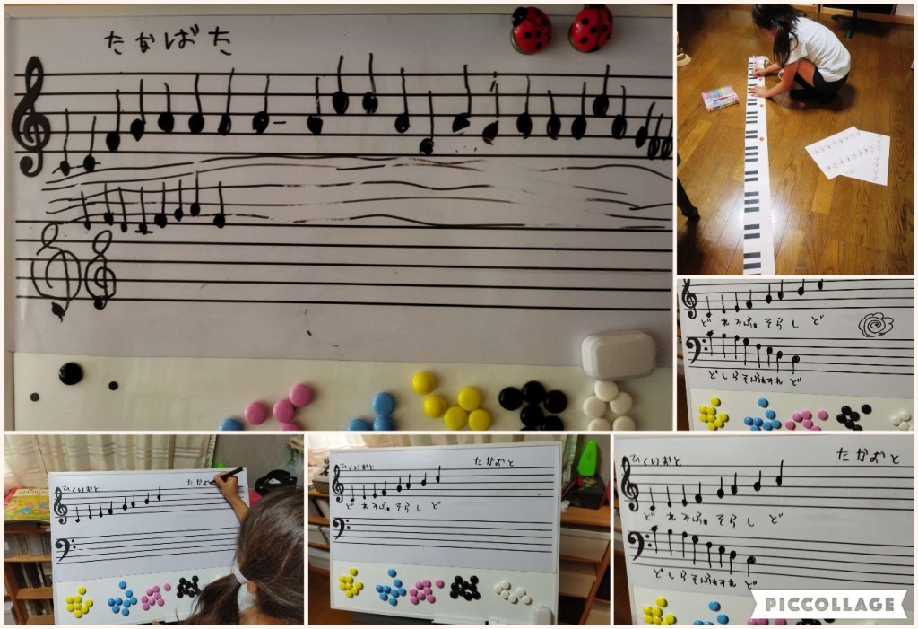 5月末からピアノをはじめたばかり、小1のHちゃんのレッスンの様子です。音符を書くのが楽しいらしい。ハ長調の音階を書いて自分で花丸❣ おぼえた曲をレッスン室のホワイトボードにどんどん書いています。